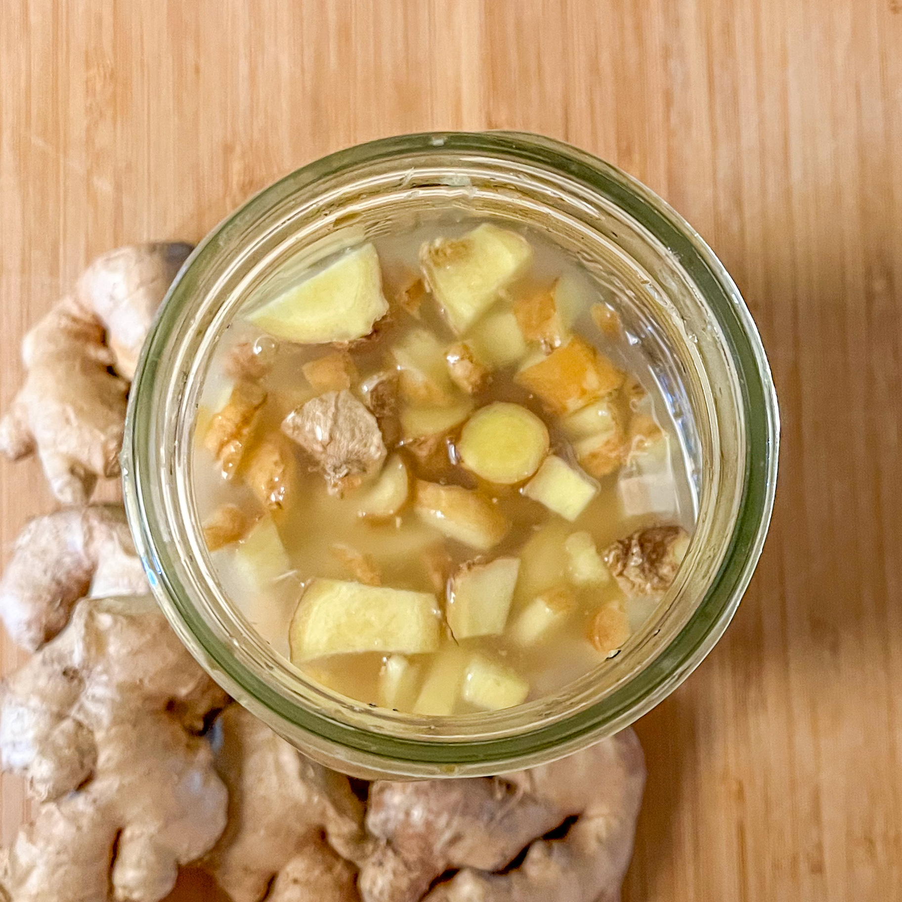1. In a glass jar, combine about 1 1/2 cup filtered water, 1 tbsp diced organic ginger, and 1 tbsp organic sugar. Stir until sugar is dissolved.